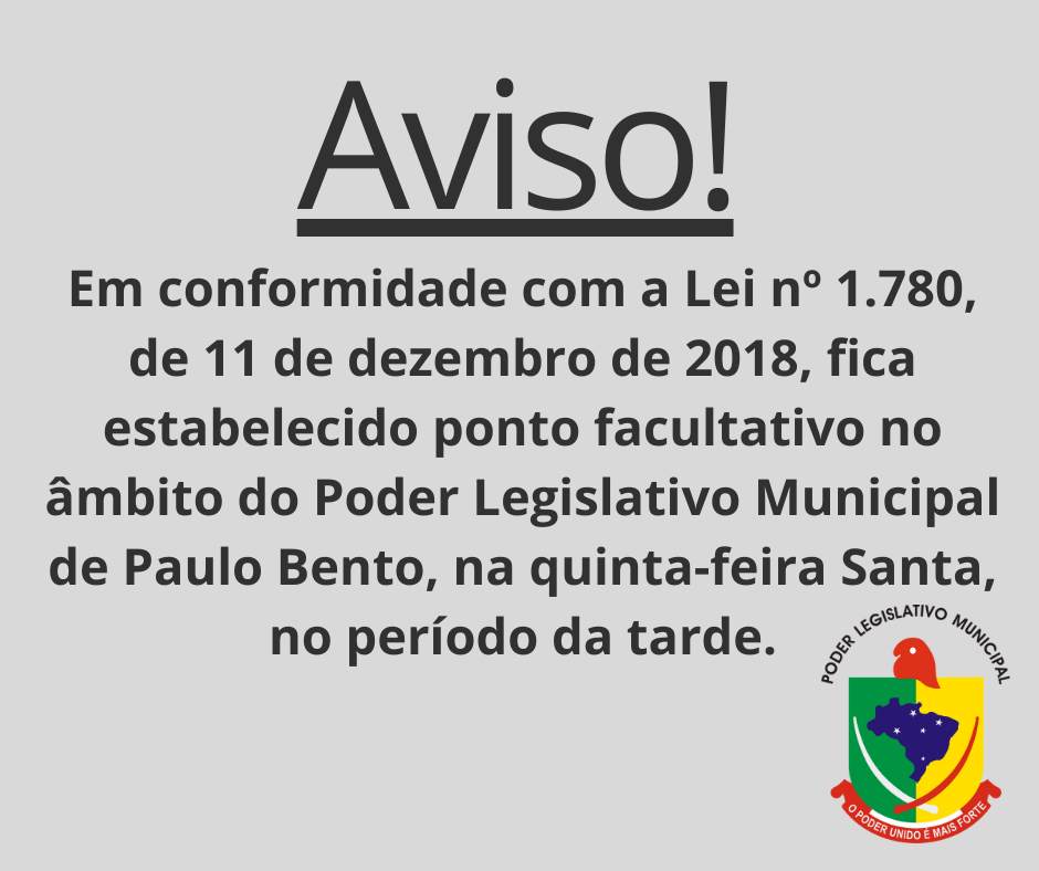 A Camara MUnicipal de Vereadores de Paulo Bento, através do presidente do Poder Legislativo Giovani Fiorentin comunica a população de Paulo Bento, que na quinta feira dia 17/04/2025 na parte da tarde será feriado, conforme Lei Municipal 1780/2018 e nos dias 18/04/2025 e 21/04/2025 também será feriado , voltando as atividades na terça feira dia 22 de abril. Agradecemos a compreensão de todos.