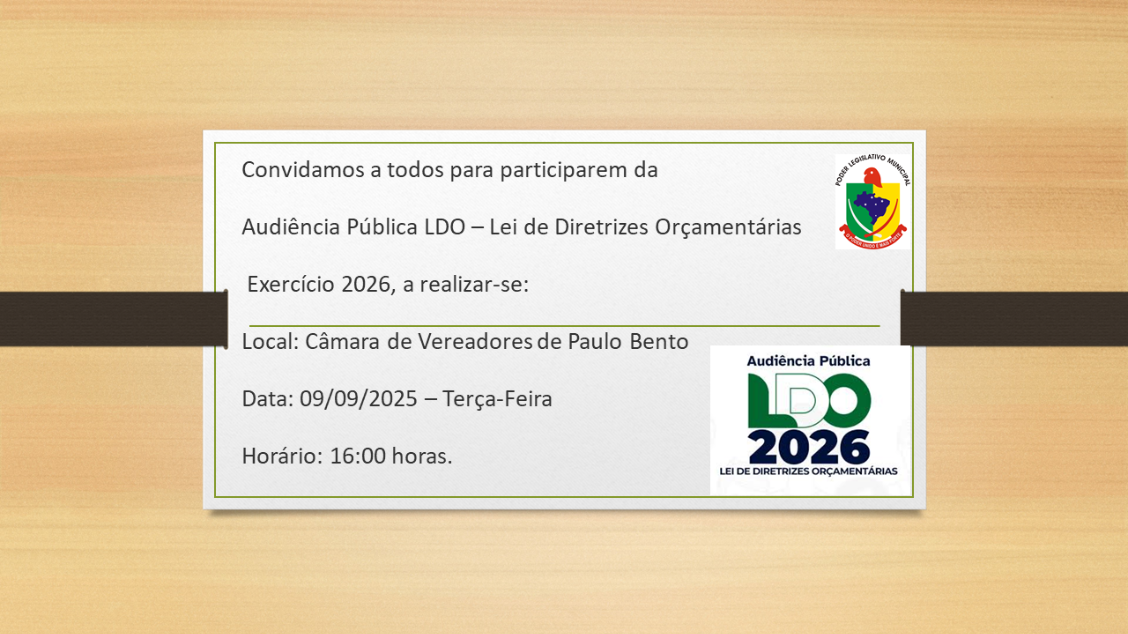 GIOVANI FIORENTIN, Presidente do Poder Legislativo do Município de Paulo Bento, Estado do Rio Grande do Sul, atendendo o disposto no parágrafo único do Artigo 48, da Lei Complementar nº 101/2000, CONVIDA a população de Paulo Bento para a Audiência Pública com a finalidade de fazer a apresentação e discussão do projeto 064/25 que DISPÕE SOBRE AS DIRETRIZES ORÇAMENTÁRIAS DO MUNICÍPIO DE PAULO BENTO/RS PARA O EXERCÍCIO DE 2026, E DÁ OUTRAS PROVIDÊNCIAS.
