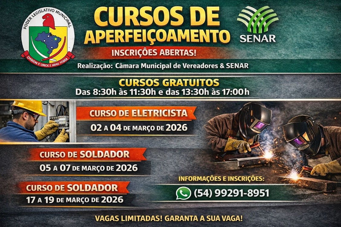 A Câmara Municipal de Vereadores, em parceria com o SENAR, estará disponibilizando cursos de aperfeiçoamento nas seguintes modalidades: