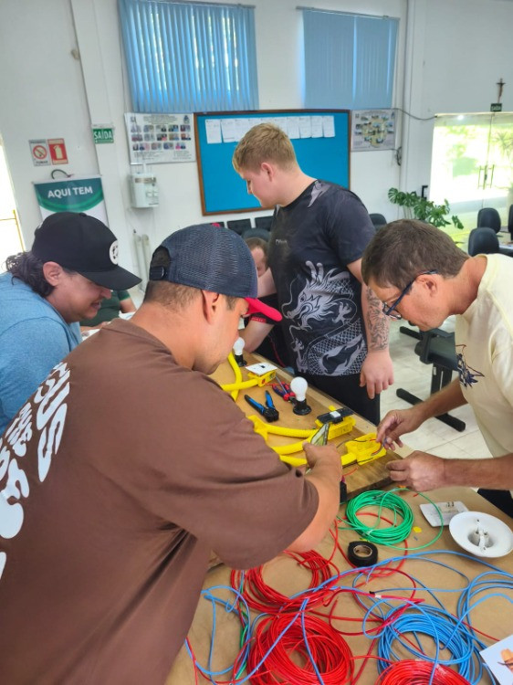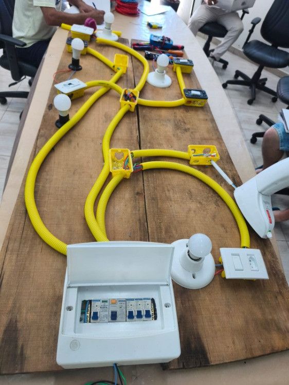 Durante o treinamento, os participantes aprenderam na prática a montar um circuito elétrico completo para o funcionamento de uma casa, desde a caixa de luz geral, onde ficam os disjuntores, até os cômodos, com a instalação de tomadas, lâmpadas, chuveiros e chave hotel, entre outros componentes.